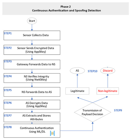 Phase 2 introduces continuous authentication. In this stage, pre-trained machine learning (ML) and deep learning (DL) models analyze incoming sensor data in real-time. Each record is evaluated for deviations in RSSI, BL, or altitude. If any attribute falls outside acceptable thresholds, the sensor is flagged as spoofed, and its data transmission is blocked. Legitimate data are processed, ensuring uninterrupted operation. Continuous authentication also enables model retraining as new data are collected. This adaptability allows the system to respond effectively to evolving threats and dynamic environments. By continually refining the model based on real-time data, the scheme enhances its ability to differentiate between legitimate and non-legitimate sensors. Phase 2 focuses on real-time detection and prevention of spoofing attacks, as shown in Figure 4.