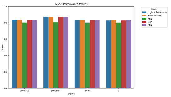 Based on the results in Table 1, RF emerged as the best-performing model, achieving the highest accuracy and F1-score at 83.74%, slightly surpassing other models. LR, MLP, and CNN exhibited comparable performance, with accuracy values around 83%, while KNN lagged with an accuracy of 80.23% and corresponding lower precision, recall, and F1-scores. These findings underscore the varying capabilities of the models in handling the dataset’s complexity.