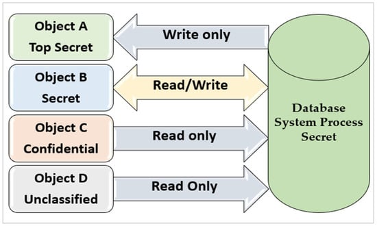 It is crucial to develop new methods for controlling the framework system during the setup of new online or cloud systems. Although many existing systems provide some degree of protection, they all possess inherent weaknesses. It is essential to develop a stronger method that ensures multilevel security to protect data and resources. This is commonly used in the military, where information is categorized as unclassified (U), confidential (C), secret (S), top secret (TS), or higher. This concept can be applied across various domains, where information is systematically categorized, and users are granted access to specific types of data. Multilevel security refers to the need to define multiple categories or levels of data. In addition, the allowed data flows in an MLS system illustrate all acceptable interactions between a subject operating at the “Secret” level and various objects with different security levels, as clearly depicted in Figure 1 with assistance from []. Furthermore, according to the Bell–LaPadula model [], which underpins the generation of the MLS/DBMS model, two key properties are enforced. These strategies are discussed in detail below: