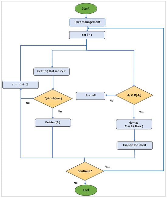 To propose an MLS integrated with a database system for implementing the projected mechanism efficiently, a strong database system is required. Figure 5 provides a flowchart detailing the proposed system administration framework, which administrators use to manage user accounts for system access. The proposed paradigm includes several data manipulation declarations. The model manages data through INSERT and DELETE operations, allowing for data manipulation based on standard SQL queries. The MLS data model explains how these INSERT and DELETE operations function, as outlined below: