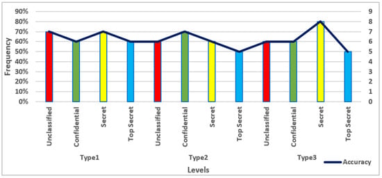 Table 3 presents a classification analysis of three authentication types, organized into four security levels: U, C, S, and T. These levels are clearly illustrated in Figure 10, highlighting the distribution of each authentication type across the security categories. The analysis emphasizes the authentication model’s performance, as each appendix table verifies and supports the effectiveness of each type at different security levels. Each type demonstrates a varying distribution of levels, suggesting differences in suitability for specific security needs. Type 1 demonstrates a balanced distribution across all security levels, with the highest occurrences at U and S levels (seven authentications each). This suggests adaptability for both moderate and highly secure environments, producing an unexpectedly robust performance across varied security requirements. Type 2 also displays versatility, with slightly higher scores in the C level (7), but has the lowest frequency at Top Secret (5), which may imply moderate suitability for highly sensitive data. Type 3, in contrast, places a strong emphasis on security, achieving the highest score at the S level (8). However, it maintains relatively consistent performance across the other levels, except for the T level (5), which is an unexpected result. This outcome seems unusual, especially considering previous research on case sensitivity and improvements, where all levels, including T level, should have demonstrated stronger performance. This pattern suggests Type 3’s potential for environments prioritizing data sensitivity and robust security. Overall, each authentication type shows distinct patterns in security level suitability, guiding their use based on confidentiality and resource requirements.