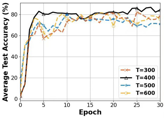 We conducted four sets of experiments using CNN models under the BHFL architecture. We used the MNIST dataset with the number of training rounds set to 30, and we used the BHFL algorithm when T is equal to 300 s, 400 s, 500 s, and 600 s to conduct experiments and observe the convergence speed and accuracy. As shown in Figure 4, when T = 400 s, BHFL shows significant accuracy at earlier rounds, presents the highest accuracy in the entire dataset, and maintains a more stable accuracy at later rounds. Compared with other time settings, the accuracy of BHFL under other time settings fluctuates more, and the final result is not as good as that of T = 400 s. Therefore, our experiments are conducted under the time interval T = 400 s setting.