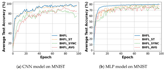 In order to demonstrate the advantages of the BHFL method in terms of convergence speed and model accuracy, we use the CIFAR-10 and MNIST datasets to test the performance of the two models, CNN and MLP, under four federated learning architectures. The experiments evaluate the four algorithms in a number of dimensions, and as shown in Figure 5, the different learning methods all show a trend of increasing accuracy and eventual convergence over time. Figure 5a,b show the speed of convergence and accuracy when trained with different models. In terms of convergence speed, BHFL quickly converges to 70% in the fourth epoch in the CNN network and 70% in the seventh epoch in the MLP network, showing faster convergence speed than several other algorithms. BHFL also has a clear advantage over several other comparison methods in terms of accuracy. BHFL is able to achieve 98.3% accuracy when using the CNN model, with an accuracy 1.1% higher than the BHFL-ST algorithm and 12% and 6% higher than BHFL-SYNC and BHFL-AVG, respectively. BHFL is able to achieve 80.3% accuracy when using the MLP model, which is 0.9%, 2.8%, and 5.6% higher than BHFL-ST, BHFL-SYNC, and BHFL-AVG, respectively.