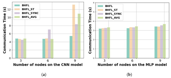 Figure 7 reflects the communication time cost of the four algorithms with different numbers of nodes. As shown in Figure 7a, we use the MNIST dataset to test the performance of the CNN model under the four federated learning architectures. As the number of nodes increases, the communication time of BHFL does not increase significantly compared to the other three algorithms due to its semi-asynchronous aggregation. When the number of nodes increases to 9, the communication time of BHFL is about 5.4 s. The communication times for BHFL-ST, BHFL-SYNC, and BHFL-AVG are 13.1, 8.3, and 10.9, respectively. As shown in Figure 7b, we also tested the communication time of the MLP model under four architectures, and we found that the communication time of BHFL performs comparably with other algorithms. It is relatively stable and fluctuates little with different numbers of nodes. This is due to the multi-objective optimization of BHFL in terms of node selection, which makes the selection of nodes to participate in aggregation more precise and efficient. Compared to other mechanisms, this optimization reduces unnecessary communication overhead. Figure 7 illustrates that the BHFL algorithm is able to effectively reduce the communication overhead while ensuring the quality and accuracy of the training results, which is well-proven to be a reasonably efficient federated learning algorithm.