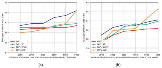 When the amount of data is large, there are more model updates to be transmitted during the training process, which leads to a larger amount of gradient information being transmitted per communication round, thus increasing the communication time. In Figure 8, we also perform comparison experiments in environments with different amounts of MNIST data. Figure 8a,b show that the communication time of the BHFL algorithm increases gradually with the increase in data volume, but the communication time of BHFL is the lowest compared to the other three algorithms under the CNN model and the MLP model, which proves that the BHFL algorithm is more effective in reducing the communication overhead when the data volume increases.