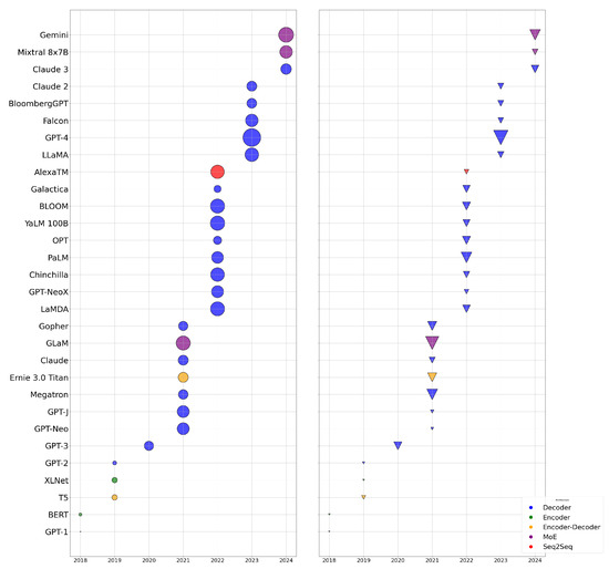 LLM by year. X-axis (Year): Indicates the introduction period of each model. Y-axis (model name, parameters in billions—B): Logarithmic scale representing the number of parameters in each model. Point size: Proportional to the size of the training dataset (in trillions of tokens). Triangle size: Proportional to the number of model parameters (in billions). Colors represent different LLM architectures.
