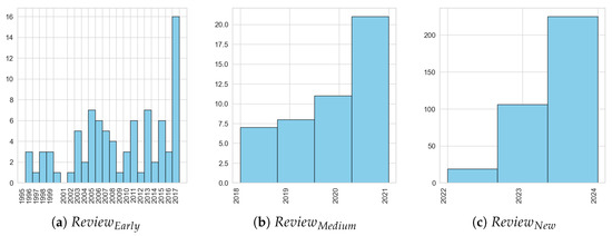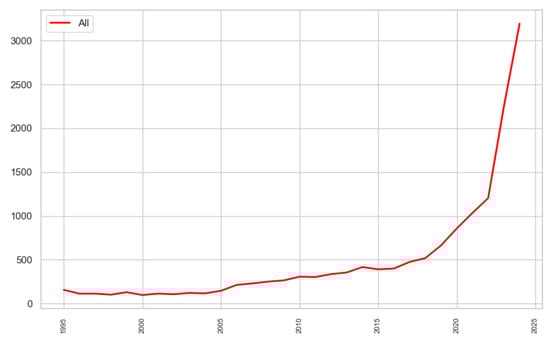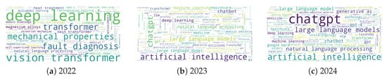 Figure 14 shows the cloud art for the keywords from 2022 to 2024. As observed, the incidence of keywords changes over the past three years. Notably, only in 2022, the keywords “Bert” and “ChatGPT” were not dominant, with other keywords such as “Deep Learning” and “Visual Transformer” being more prominent. In 2023, the most relevant keyword was “Artificial Intelligence”, followed by “ChatGPT”. However, in 2024, the trend reverses, with “ChatGPT” emerging as the most used keyword, reflecting the widespread adoption of this technology in recent times.