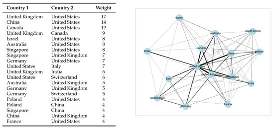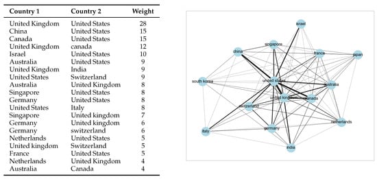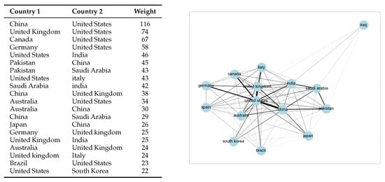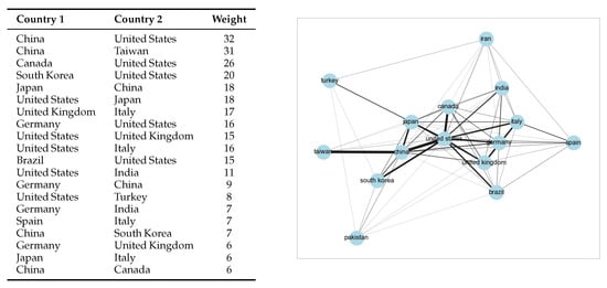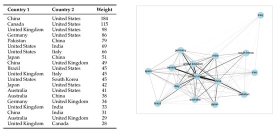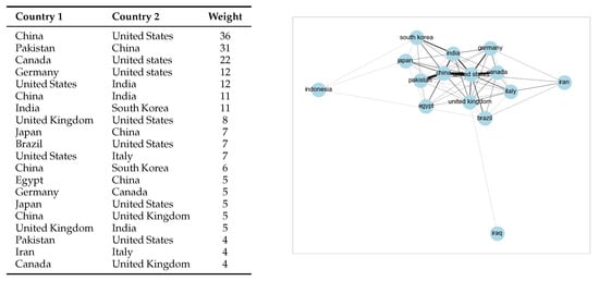 The third analysis centers on collaboration by constructing a network that connects various entities. Each link in the network quantifies the intensity of their collaborative interactions. In this study, the entities involved are: affiliations and countries. More specifically, a collaboration analysis is a graph, where each vertex is an entity and each link between the pair of nodes and represents the fact that they have, at least, one paper in which they both appear. The weight of the link , related to , is the number of papers co-authored by and . Let us note that the collaboration relationship is bidirectional, so the graph is undirected.