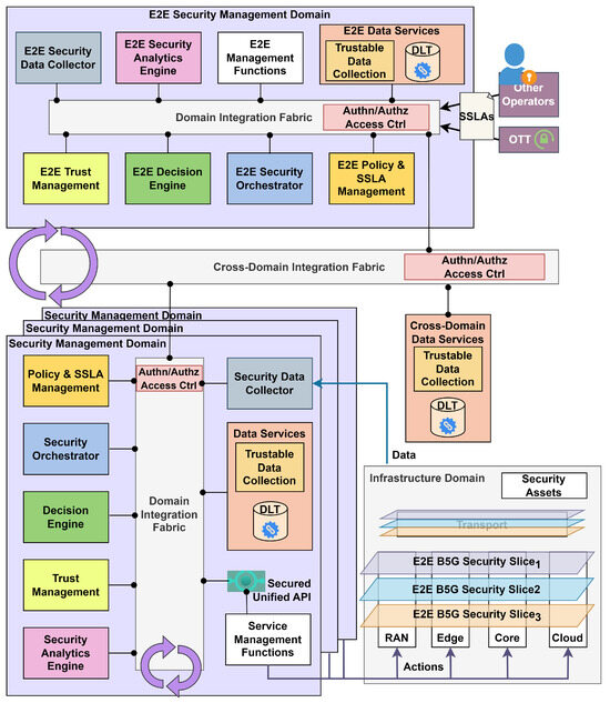 The decisions taken within the closed loops are tailored to the requirements specified in the intent. As an innovation, we integrate DLT-based trust management to ponder decision making at its various steps; more details can be found in [41]. Trust is evaluated through continuous SSLA monitoring and analysis. Trust metrics represent the historical assets’ and domains’ behavior for SSLA compliance. Genuine behavior is rewarded, while vulnerabilities are punished. In ETSI’s ZSM definition, single management domains are able to self-manage their own services and infrastructure, but for cross-domain actions, an E2E domain is used. As a novelty, our E2E domain vision presents a centralized data analysis that correlates security information from different domains. This view expands the security coverage across the entire infrastructure, including Federated Cyberthreat Intelligence (CTI) sharing, cross-domain threat mitigation, and the redeployment of mistrusted assets among other E2E domain functionalities.