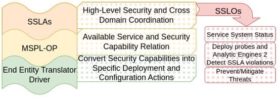 The SSLA serves as the entry point to the evolved ZSM architecture as explained in [42] inspired by the work in [43]. The SSLA is a formal agreement between a service requester, such as an over-the-top (OTT) or other operator, and the provider. The SSLA is the first intent: it defines security and service level objectives (SSLOs), spanning from the QoS requirements (throughput, latency, resource usage, etc.) to the security requirements (confidentiality, privacy, authentication, specific attacks protection, etc.). SSLOs define the genuine system’s status for a concrete service. The ZSM framework uses SSLOs to drive decisions toward their fulfillment. During this process, monitoring probes and analytic engines are deployed to predict and detect SSLA violations, and finally prevent or mitigate the threats. Therefore, the final step for an SSLA enforcement process is the appliance of specific actions to continuously maintain the system’s status specified by the SSLOs. The SSLA enforcement process usually covers cross-domain coordination. Final actions cannot be taken directly; however, the SSLOs require proper refinement to map their objectives with a domain-related intent. In this regard, the refinement transforms the SSLA into an orchestration policy, named MSPL-OP (see Figure 3 and Figure 4 step 1).