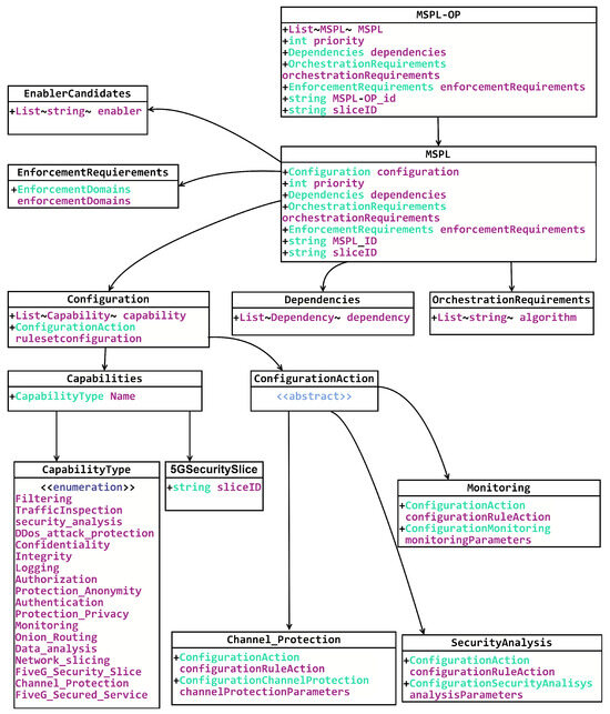 To bridge the gap between the SSLA and actionable deployments, the MSPL-OP serves as an intermediate abstraction. It establishes the means to achieve every SSLO but does not specify concrete actions. In fact, the refinement process maps SSLOs to security capabilities. Every MSPL contains one or more capabilities, while an MSPL-OP contains one or more MSPLs. The MSPL-OP model is specified in Figure 3. SSLOs are categorized to be covered by one or more capabilities. This is precisely what the refinement process entails: transforming SSLO categories into a set of defined security capabilities. For this work, the MSPL-OP model has been extended in several ways. Relevant to this section is the incorporation of 5GSecuritySlice, allowing the specification of a 5G slice. A 5G slice is composed of a set of intertwined 5G services with security capabilities associated with those services. The 5G slice also differs from the regular MSPL-OP, as it requires multi-domain coordination. Intertwined services and security must be deployed to cover every 5G domain. In summary, the MSPL-OP model has been extended to address the requirements of a 5G slice deployment.