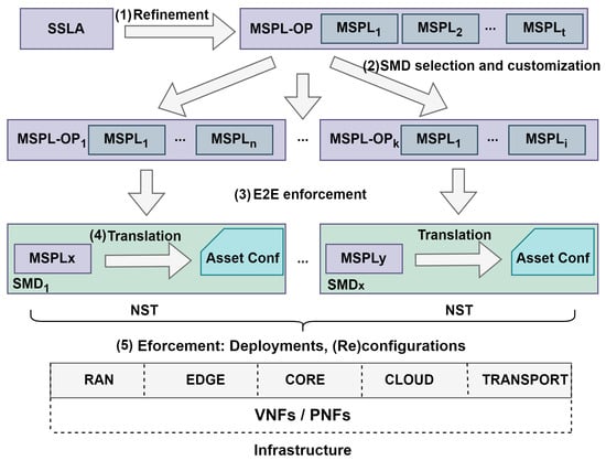 Each SMD, upon receiving an MSPL-OP, before translating it into a final asset deployment and configuration action, analyzes feasibility and checks for conflicts with active policies. To ensure consistency, SMDs extract individual MSPL policies from the MSPL-OP and evaluate them for conflicts using rule-based engines. This step ensures that the translation of MSPLs into assets and configurations maintains system consistency. At this stage, each MSPL might imply actions across various devices, such as deploying VNFs, reconfiguring existing services, or other possibilities dependent on the SMD’s infrastructure, geographical location, or any other physical or administrative property (e.g., support for Kubernetes). This means the translation process is infrastructure-, topology-, and environment-aware. To achieve this, the translation process (see Figure 4, step 4) selects assets that handle the capability specified in the MSPL and are available for deployment and configuration within the current SMD premises. For a 5G slice, all translations are packaged as a network slice template (NST), which, in an overview, represents a sub-slice of the E2E slice. The NST then provides the means to enforce every capability and service requested in the policy model, as well as to ensure the interconnection between components of the sub-slice and across domains.