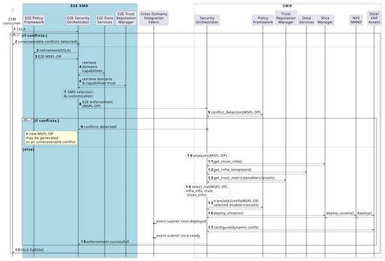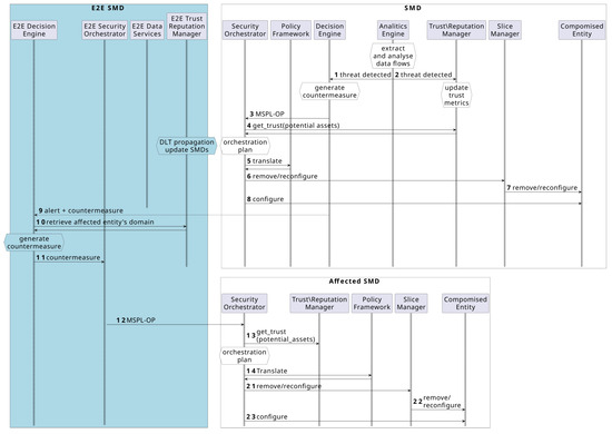 Although not depicted in the figure, resource unavailability or other conflicts may arise, requiring additional countermeasures or reconfigurations. These steps are omitted for simplicity; only the expected positive path is depicted. Locally employed alerts and countermeasures are reported to the E2E level, which may trigger cascading effects on other SMDs. This possibility is shown starting from step 10, where a neighboring affected SMD reconfigures the slice as a result of the MSPL-OP received in step 12. In this step, any involved asset might be replaced with an alternative that has higher trust or a better score in relation to the newly detected threat, as described in steps 1 and 2.