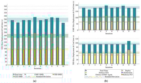 E2E B5G slice deployment and configuration initial time. (a) Use case initial time; (b) time consumed per procedure per SMD.