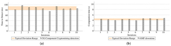 We start with the monitoring probes. Figure 11a shows the time it took for the STA detector to identify cryptomining traffic. The results are promising, with an average detection time of just 87.08 milliseconds, demonstrating the efficiency of the detection mechanism. Additionally, Figure 12a highlights the occurrences of false positives and false negatives when analyzing a pcap file captured from the 5G core, containing both cryptomining and 5G signaling traffic. With prior knowledge of the expected outcomes, the model achieved an average false negative rate of 0.022% and a false positive rate of 0.013%, reflecting outstanding accuracy. Over 3200 classifications per iteration were performed, and the system consistently exhibited robust performance throughout the experiments. It is important to highlight that in cybersecurity contexts, false positives are particularly significant because they can trigger unnecessary actions within the framework. Our model demonstrates better performance in this regard than other models as explained in [34]. Furthermore, the STA in this scenario is confined to a network slice, resulting in only a minimal number of erroneous values. Nevertheless, it is important to consider the error deviation associated with false positives and apply appropriate threshold quotas to avoid misguided actions that could negatively impact overall system performance. Regarding false negatives, although the results show a minimal detection rate of this kind, in a large-scale system, even a small fraction of undetected cryptomining traffic can translate into significant illicit resource usage. Employing more sophisticated models that leverage multi-layer inspection and incorporating enhanced data quality and variety can further improve detection performance and mitigate the impact of false negatives.