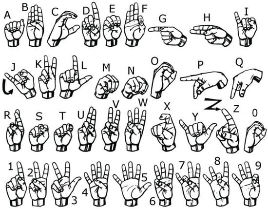 The entire system is consolidated onto a single circuit board and interfaced with an Arduino Uno microcontroller [24]. Using a four-pole, adjacent electrode sensing method, the system systematically injects the current through an adjacent pair of electrodes and sequentially measures BVs across the remaining electrode pairs. The experimental protocol includes 36 different ASL signs as shown in Figure 2, with each sign characterised by 40 boundary voltage measurements, derived from 10 peak-to-peak averages per measurement. The dataset is collected from 10 healthy subjects performing each sign ten times. To minimise the forearm muscle fatigue, a 2-s interval is maintained between gesture repetitions. Additionally, a 5-min rest period is provided after every nine gestures to ensure that the fatigue parameter does not influence the measurements.