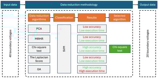 In order to reduce the number of EIT measurements, our methodology presented in Figure 3 built on our previous study [38], which evaluated different dimensionality reduction algorithms. Genetic Algorithm (GA), PCA, Chi-squared tests, MRMR algorithm, and Laplacian scores were used to reduce the number of measurements from 40 to 20. In [38], it was shown that GA achieved the highest accuracy among the methods tested. However, in terms of computational time, GA was found to be extremely resource-intensive. The iterative nature of GA, involving the evaluation of multiple candidate solutions over generations, leads to high computational complexity, making it unsuitable for applications requiring real-time performance. In addition, GA can be sensitive to the choice of parameters such as population size, crossover rate, and mutation rate, which can require extensive tuning to achieve optimal results. Furthermore, the stochastic nature of the algorithm means that it does not always guarantee convergence to a globally optimal solution, especially in time-constrained applications. Due to these limitations, GA is not considered in this study as the goal is to develop a real-time system that can be implemented on edge devices where computational resources and power consumption are critical considerations. Support Vector Machine (SVM) classifiers were employed to classify EIT data both before and after the dimensionality reduction process. The SVM was selected due to its performance in high- and low-dimensional spaces, making it an appropriate choice for the feature sets of EIT data. Its ability to maximise the margin between classes ensures robust decision boundaries, reducing the risk of misclassification even with a reduced number of features.