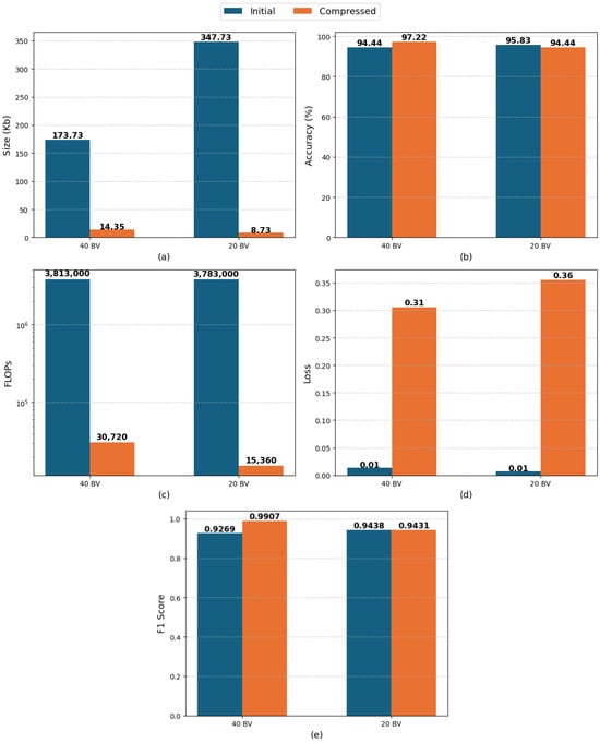 The F1 score, defined as the harmonic mean of precision and recall [41], serves as a comprehensive measure of a model’s performance by balancing its ability to correctly identify positive instances (precision) and capture all relevant instances (recall). The F1 score results highlight the strong predictive performance of the initial models, with values of 0.9269 for the 40 BVs model and 0.9438 for the 20 BVs model. After compression, the 40 BVs model shows a significant improvement, with the F1 score increasing to 0.9907. This increase indicates that the compression technique not only reduces the model size, but also improves generalisation by reducing overfitting, especially in scenarios with larger input dimensions. For the 20 BVs model, the F1 score remains nearly unchanged at 0.9431 after compression, demonstrating the stability of the compression process in preserving critical predictive capabilities. These results underscore the effectiveness of compression in maintaining or even improving performance metrics such as the F1 score, ensuring the reliability of these optimised models for use on edge devices.