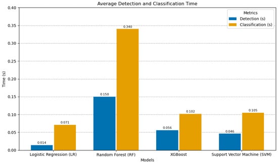 This experiment evaluated the average detection and classification times of the proposed tool using four ML algorithms: LR, RF, XGBoost, and SVM. These metrics highlight the tool’s real-time capability and its suitability for continuous monitoring and dynamic profiling in high-security environments.