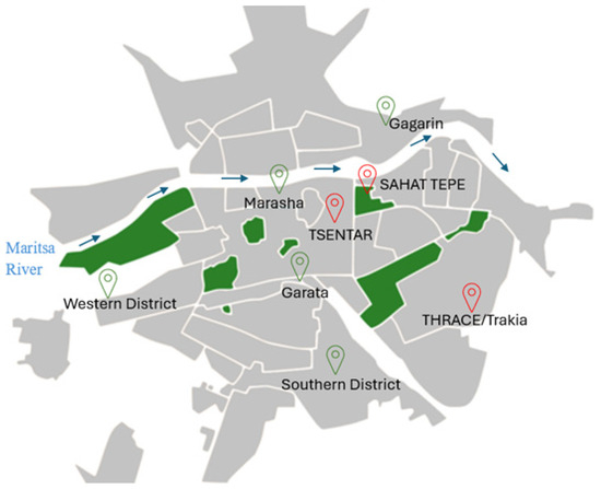 Our network includes 11 sensor complexes located at key points in the city of Plovdiv and multiple sensors in the surrounding towns. The sensors measure the concentration of various pollutants, including fine particulate matter (PM10 and PM2.5), nitrogen oxides, ozone, and other gases that affect air quality. In addition to major air pollutants, sensors in our network also report data on temperature, atmospheric pressure, humidity, gamma radiation, and more. The data, available at [4], is collected in real time every 5 s and analyzed using specialized software platforms. The aim of the network is to provide the public and local authorities with accurate and timely information on the air quality in the measured residential areas. The system is part of an effort to raise awareness of environmental issues and create a healthier and more sustainable urban environment. In Figure 1, we have marked in red the areas of the city that have sensors from our network and external sources, and in green, we have marked some of the sensors we monitor in areas of the city where data from other sources are not available.