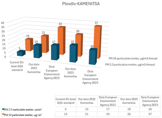 With the following charts, we visualize the comparison of data from our sources and those of the European Environment Agency. The chart (Figure 2) shows the concentrations of fine particulate matter (PM) PM2.5 and PM10 in Plovdiv-Kamenitsa, comparing them with the current European Union standards and the European Environment Agency data for 2022 and 2023.