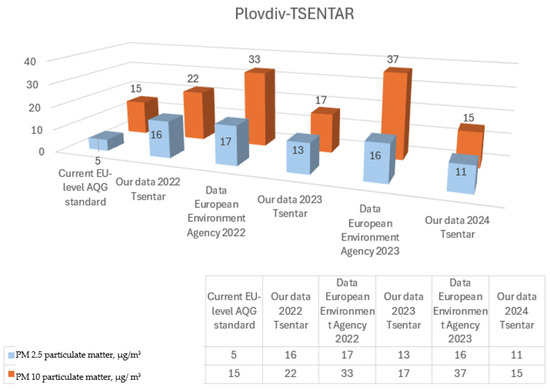 The following chart (Figure 3) shows the concentrations of fine particulate matter (PM) PM 2.5 and PM 10 in Plovdiv-Tsentar, comparing our data with external sources.