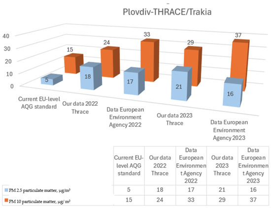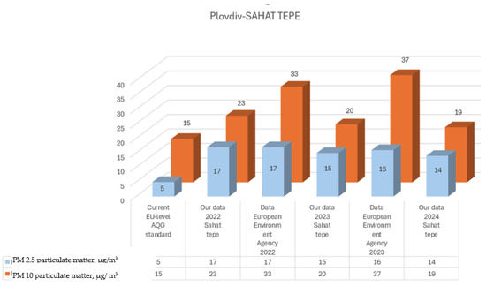 The chart (Figure 5) shows the annual levels of fine particulate matter (PM2.5 and PM10) for the Sahat Tepe area of Plovdiv and it also compares the current European Union (EU) standards and European Environment Agency data for 2022 and 2023. Our measurement data in 2022 and 2023 show that the levels of PM2.5 and PM10 in the Sahat Tepe area exceed European air quality standards but are still at levels that can be improved. Comparison with European Environment Agency data for 2022 and 2023 shows levels of PMF above EU standards, but with significant variation by year and particle type. In 2022, the European Environment Agency PM10 levels were higher (33 µg/m3) compared to our data (23 µg/m3), and in 2023, the EPA PM10 levels (37 µg/m3) were higher than our data (19 µg/m3).