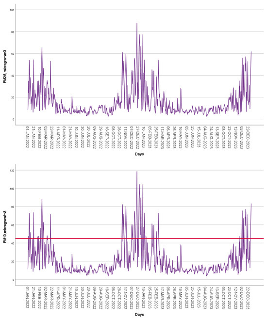 The analysis of the data (Figure 6 and Figure 7) for the winter period shows that the values vary above the average daily and annual standards for the protection of human health, specified in [9,10]. The comparison of the values during the winter season with those registered during the summer period leads to the conclusion that the levels of this pollutant are directly related to domestic heating (increased consumption of solid fuels for heating) and car traffic. In combination with unfavorable climatic conditions and characteristic topographic features that disrupt the dispersion of emitted pollutants, high concentrations are registered. These factors, combined with Plovdiv’s specific topographical and climatic characteristics, hinder pollutant dispersion, leading to elevated concentrations of fine particulate matter. The urban landscape, featuring high-density construction and syenite hills, further amplifies pollution retention.