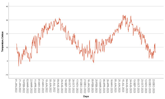 The data presented in this study are openly available in Meter, https://meter.ac/gs/nodes/. World Health Organization’s system: https://www.c40knowledgehub.org/s/article/WHO-Air-Quality-Guidelines?language=en_US#:~:text=The%20WHO%20air%20quality%20guideline,3%20%2D%204%20days%20per%20year (accessed on 15 January 2025).