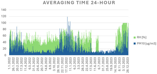 The relationship between relative humidity (RH) and PM10 (Figure 7) content can be described as a positive correlation under certain conditions, for example,