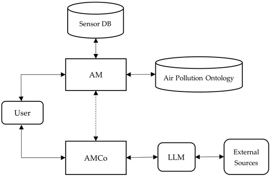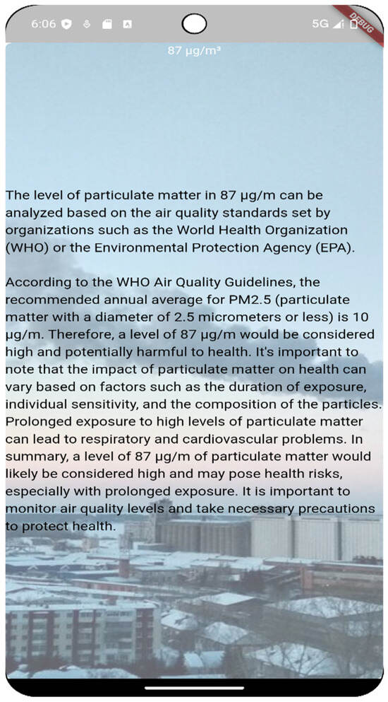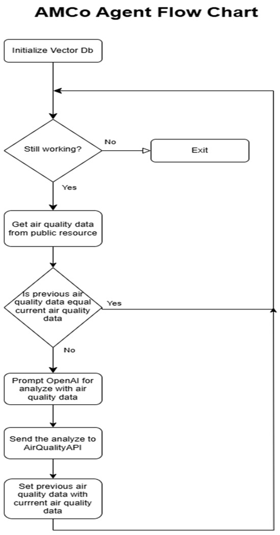 The current prototype version of AMCo consists of the following three components: the AMCo Agent, AirQualityApi, and AirQualityMobile. The AMCo Agent is a Python 3.9 project using the LangChain library and the OpenAI Large Language Model. The agent is able to analyze particle levels of unstructured data obtained from different sources of information. The agent first reads the resources (in the experiment presented, these are the World Health Organization guidelines for monitoring particulate matter pollution [32]), which it uses to initialize its internal vector database. For this purpose, it does an internal transformation of the text (converting it from .pdf to .txt) before generating the representation in the vector database. The next action of the agent is to connect OpenAI to the local vector database. This completes the preparation phase, and AMCo goes into operational mode. In the test experiment, every minute, the agent generates a query to an external source (in this case [27]) to retrieve information about the current state of particulate matter in the city center of Plovdiv. If the result is different from the previous state, a query is generated and sent to OpenAI to analyze the results, and then the result is forwarded as a query to AirQualityApi. AirQualityApi is a .NET API using MongoDB as the internal database. This AMCo component operates as a service used to store the results and provide access to them to the mobile application. In our case, it stores the current air dust status along with the analysis results from OpenAI. The AirQualityMobile application, used by AMCo, visualizes these analysis results. This app makes a request to AirQualityApi for visualization data every minute, ensuring that the analysis is refreshed whenever pollution levels change.