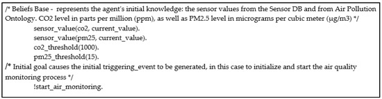 The Beliefs Base is a discrete structure that models an agent’s perception of its environment. Individual beliefs are represented as predicates (in the style of the Prolog logic programming language). The structure consists of two base components, static and dynamic (Figure 9). The static component contains parameters with immutable values (usually threshold and limit values) used to estimate the air condition and the type of pollutants. This component is initialized by interacting with the Air Pollution Ontology, from which the necessary parameters are extracted. The dynamic component models the current air status. The values of the dynamic parameters are extracted from the Sensor DB, which contains hot data from the actual measurements. Any change to the Beliefs Base (deleting or adding a belief) triggers an actual event and updates at a predefined time interval. A sample Beliefs Base segment is given in Figure 10.