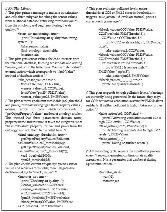 The Plan Library (Figure 11) stores AM plans, each following a three-component structure: triggering_event: context <- body, where: and <-serve as separators. Updates to the AM’s beliefs or intentions—either additions (+) or deletions (−)—are modeled through events.
