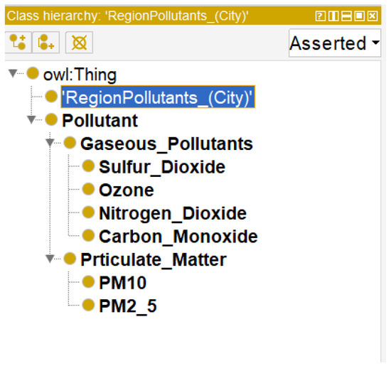 The ontology incorporates the standard threshold values for air pollutants defined by the World Health Organization (WHO), ensuring a globally recognized baseline for air quality assessment. Simultaneously, its architecture is designed to be extensible, allowing for the addition of specific data for individual regions. For example, the region of Plovdiv is included with detailed pollutant thresholds based on its unique geographic, industrial, and climatic characteristics.