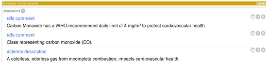The axioms created in the ontology are associated with threshold values for various air pollutants as defined by the World Health Organization (WHO) standards. These values, measured in milligrams per cubic meter (mg/m3), typically represent average daily concentrations, although some thresholds may also include annual averages or shorter-term values. The threshold values may vary across different regions depending on their specific characteristics, such as geographic location, the presence of industrial zones, heating methods, traffic levels, and other environmental or socioeconomic factors.