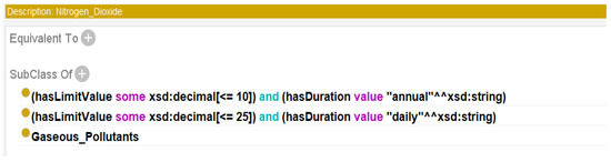- Such axioms are developed for all pollutant classes in the ontology. These axioms enable the ontology to precisely capture and differentiate between the temporal applicability of air quality standards. Using properties such as hasLimitValue and hasDuration ensures semantic clarity and allows for automated reasoning about compliance. For example, the ontology can determine whether observed pollutant levels adhere to these thresholds and flag non-compliance for further action.