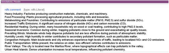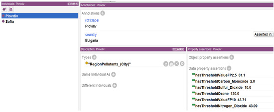 To address this variability, we introduced individuals within the class RegionPollutants_(City). Each individual in this class represents a specific city or region and is defined using data properties that link the individual to its corresponding threshold values. For example, the thresholds for air pollutants in the region represented by the individual Plovdiv are detailed in Figure 17.