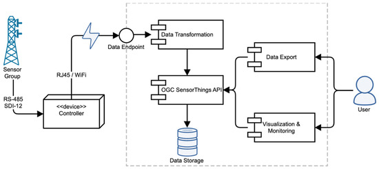 At regular intervals (typically every 1 to 5 min), the controller transmits the data package to the Data Endpoint of the software system. Upon arrival, the data package is directed to a Data Transformation module. Its primary function is to decompose the data package into a series of individual measurements, each associated with its respective value and metric. The implementation of the Data Transformation module leverages the Node Red’s Flows [35]. For every measurement, the Data Transformation module initiates a discrete REST request to the OGC’s SensorThings API, which, in turn, stores the measurement in the Data Storage. The Fraunhofer IOSB implementation [36] serves as the backbone for the SensorThings API. PostgreSQL, enhanced with the TimescaleDB extension [37], serves as the designated Data Storage. Once the data are securely stored in the Data Storage, retrieval becomes possible through a variety of SensorThings API read methods. These methods accommodate a broad spectrum of filters, allowing for meticulous customization of the retrieved data. Applications, such as Grafana [38], can leverage SensorThings API read methods for monitoring, visualization, or data export. Grafana, for instance, features a convenient preconfigured data source for seamless integration with the SensorThings API.