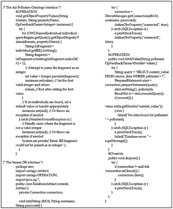 To interact with its environment, AM uses two interfaces implemented in Java and embedded as external routines in the corresponding plans. Integration is relatively easy since JaCaMo itself is also implemented in Java. The interfaces to the Air Pollution Ontology and Sensor DB are presented in Figure 20.