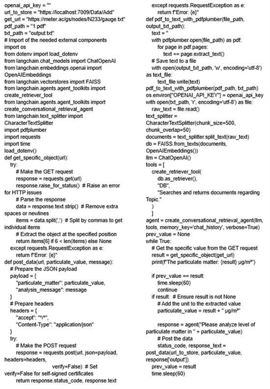 The Air Monitor Copilot (AMCo) is a copilot agent based on the ReAct architecture that we use to examine and evaluate air pollution data in the Plovdiv region from external sources. The ReAct framework [42] uses a combination of task decomposition, reasoning loops, and multiple issue resolution tools. The ReAct agents of the LangChain library can support a complete query processing process. Using these agents, we can break complex queries into manageable steps and execute them systematically. In the context of LangChain, dialog agents can exhibit dynamic behavior, integrating different data sources and services. LangChain agents can use a language model as a reasoning engine. Unlike chains where the sequence of actions is predefined, agents use language models to determine the sequence of actions based on the given context. LangChain allows us to easily integrate tools and APIs to improve the functionality of language models. This includes connecting models to external data sources and services, allowing for more dynamic and intelligent applications. By giving language models access to APIs and custom tools, developers can create more flexible and context-aware applications ranging from data mining to performing specific actions based on model output.
