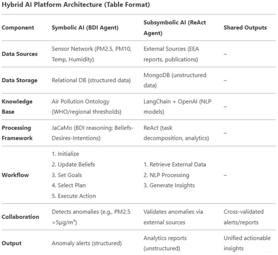 Plovdiv faces significant air pollution challenges due to geographic, climatic, and industrial factors, making accurate air quality assessment critical. This study presents a hybrid multi-agent platform that integrates symbolic and sub-symbolic artificial intelligence to improve the reliability of air quality monitoring. The platform features a BDI agent, developed using JaCaMo, for processing real-time sensor measurements and a ReAct agent, implemented with LangChain, to incorporate external data sources and perform advanced analytics. By combining these AI approaches, the platform enhances data integration, detects anomalies, and resolves discrepancies between conflicting air quality reports. Furthermore, its scalable and adaptable architecture lays the foundation for future advancements in environmental monitoring. This research represents the first stage in developing an AI-powered system that supports more objective and data-driven decision-making for air quality management in Plovdiv.