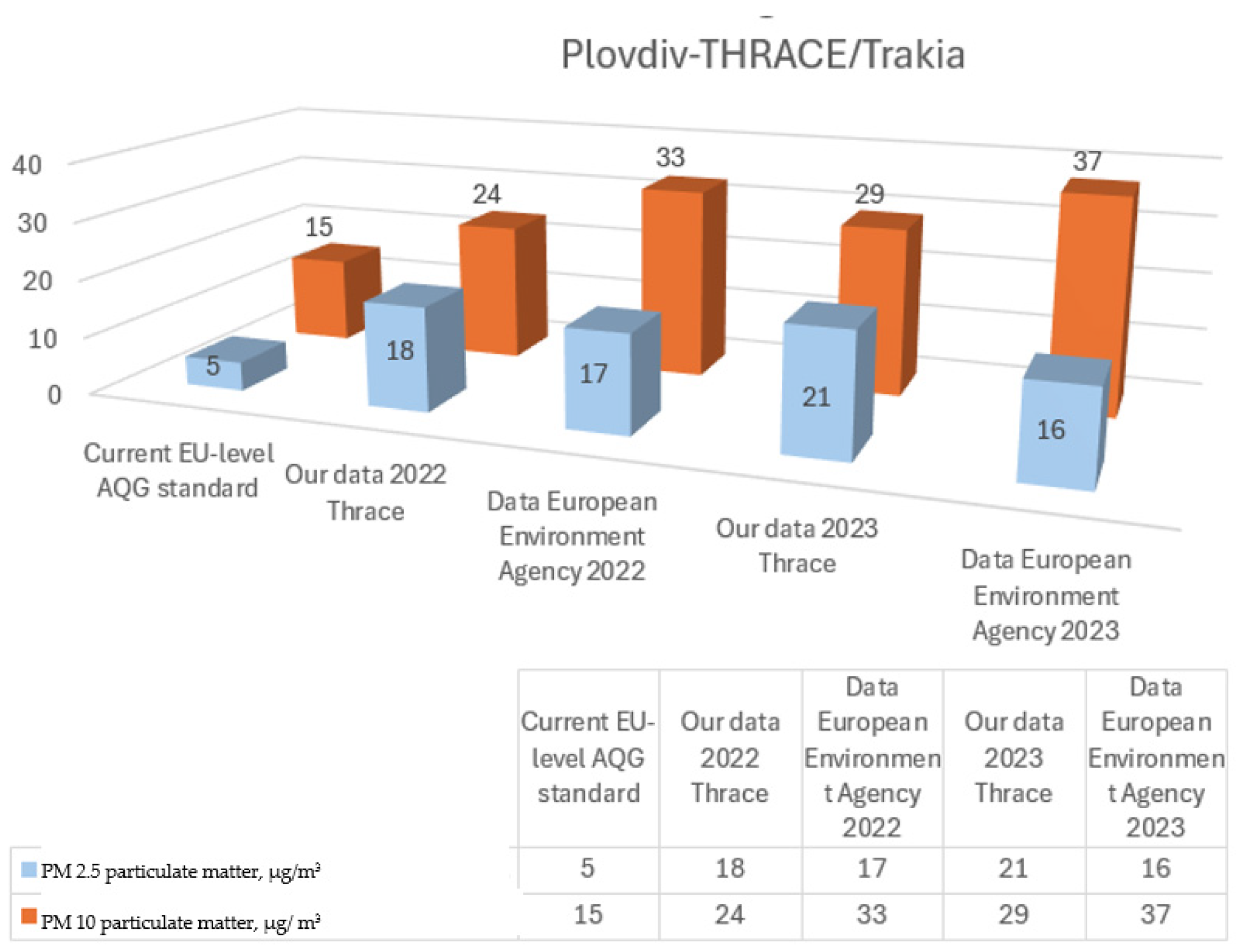 The annual data from our and external sources for the Plovdiv-Trakia region for PM2.5 and PM10 by year compared with data from the European Environment Agency and EU standards show the following: