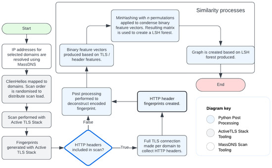 The initial steps involved resolving the domains to their respective IP address. The domain resolution to IP was performed using MassDNS [26]. The output from the MassDNS scan of the domain:ip format was then appended with the ten curated ClientHellos used by the ActiveTLS tool, to ensure parity of results across the datasets.