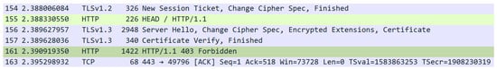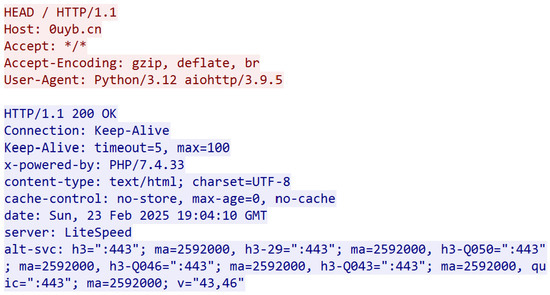 The HTTP header collection occurred as an optional post-processing step, executed through a HEAD request following TLS connection establishment. Unlike Sosnowski et al. [27], who captured only the Server header—commonly overwritten in CDNs—our methodology preserved all header keys in their original sequence, while discarding values except where explicitly specified. In the base implementation, only the Server value was retained. Header ordering was maintained as a critical metric for application similarity mapping. The collected headers were then hashed, using MurmurHash3. The Python aiohttp module was used during the implementation of the enrichment process, to asynchronously make each HEAD request. During the header collection, the session keys were written to key.log file, to enable future decryption of the session if required. An example of a full HEAD request taking place within Wireshark can be seen in Figure 3, with the corresponding HTTP header response being seen in Figure 4.