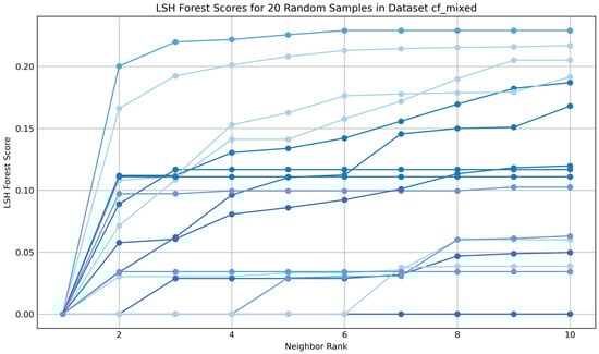 The LSH forest can be queried using a linear scan by domain approach, which retrieves the k-nearest neighbours to a given domain through a combination of LSH forest traversal and linear scanning. This method provided an effective means by which to visualise and assess the success and stability of the similarity calculations. For TMAP functionality, the distance to the given domain was inversely related to its proximity, i.e., the closer the domain, the lower the distance value, with an exact match represented as 0.0. To evaluate the results, 20 random domains from each dataset were queried for their nearest ten neighbours, and the distance from the origin (0.0) was plotted against the k-nearest neighbours. Figure 6 displays the results for Dataset A (Mixed Host), in comparison to Dataset B (Cloudflare CDN), as shown in Figure 7: