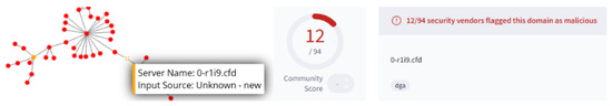 Domains appearing in suspicious clusters were first evaluated through Virus Total, which aggregates detection results across security vendors. Following a similar methodology to that established by Anderson et al. [32], a domain was only reclassified as malicious when a minimum of four independent vendors flagged it as suspicious or explicitly malicious. An example of this can been seen in Figure 8:
