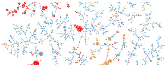 The LSH forest of dataset A visualised using Fearun. Known bad domains are colored red, known good are colored blue and unknown domains are colored orange.