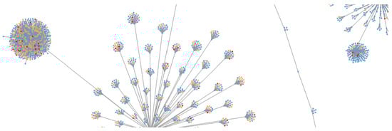 For the Mixed Host dataset, malicious nodes formed natural groups—indicating that there is a high similarity between malware domains across TLS and HTTP features. Figure 10 shows a proportion of the final graph, where the diversity between known good domains is evident by the high level of branching. This dataset had dimensions n = 17,711 (fingerprints) and d = 2133. The statistical analysis of the domain evaluations can be found in Table 5.
