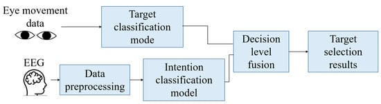 EEG information can reflect human intentions effectively. The intention of the user to interact can be confirmed using EEG [17]. Some research has already verified the feasibility of combining gaze with EEG. For example, Huang et al. [18] controlled the cursor movement by combining gaze and EEG information and compared it with the gaze-only control method. The comparison results showed that the combination of gaze and EEG achieved higher accuracy in controlling the cursor. Wang et al. [19] designed a semi-autonomous object-grasping system based on eye movements and EEG for patients with physical disabilities. The system calculates the user’s attention value through EEG signals. When the attention value exceeds a set threshold, the system activates a robotic arm to grasp a static target the user is eyeing. Yi et al. [20] proposed a multimodal target recognition model to help patients with disorders of consciousness in clinical communication. The model uses a multi-scale convolutional network to extract features from the EEG and visual data and recognizes patient-selected text according to these features.