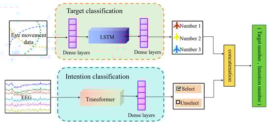 Figure 2 shows the multimodal interaction model constructed in this paper. The target classification model uses LSTM, and the intention classification model uses the transformer network. The input of the target classification model is the operator’s gaze trajectory. The LSTM is used to extract eye movement features, and the current target that the operator is gazing at is output through the dense layers. The input of the intention classification model is the operator’s EEG signals. The transformer network extracts the EEG features, and then the current operator’s intent is output through the dense layers. Finally, the output of the target classification model is concatenated with the output of the intention classification model to obtain the final interaction result for target selection.